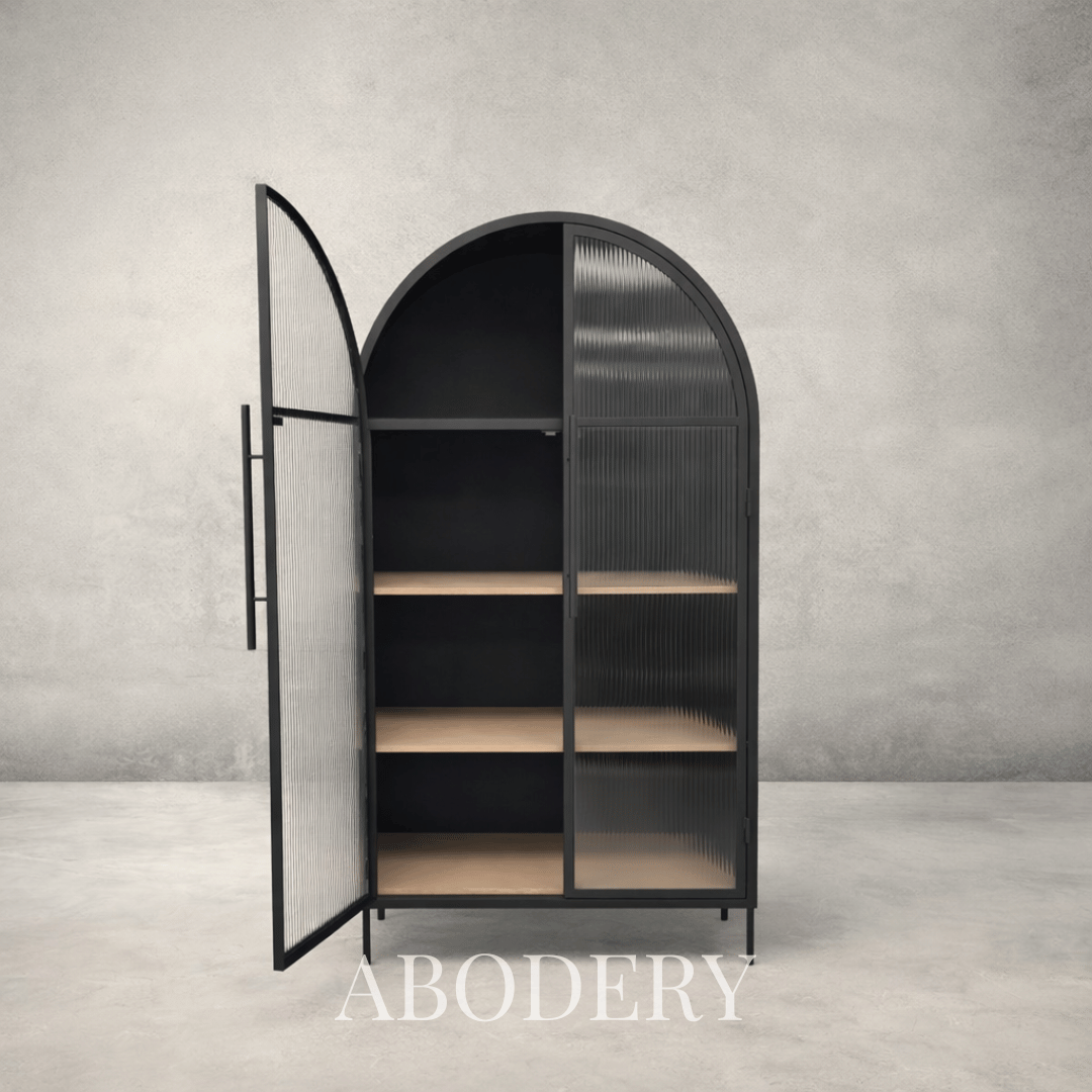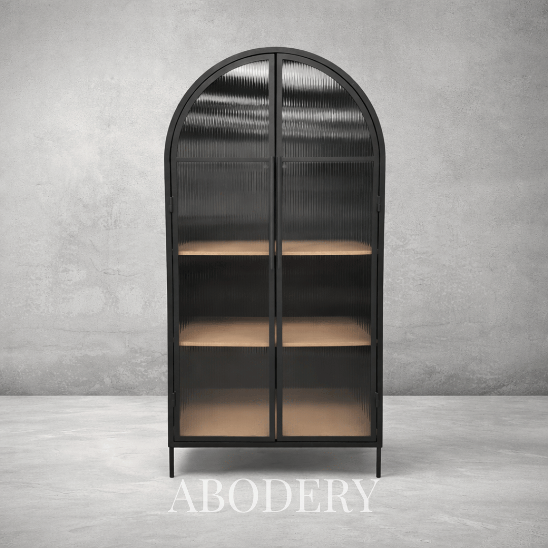 Discover timeless sophistication with our arch-shaped Kiki Cabinet featuring fluted safety glass doors and wood shelves.